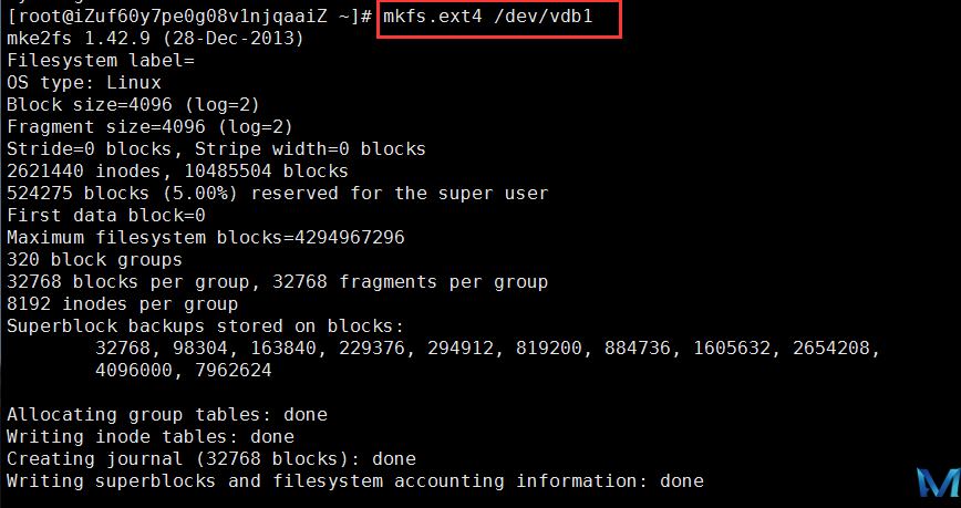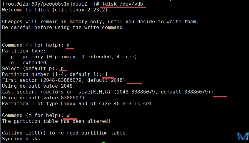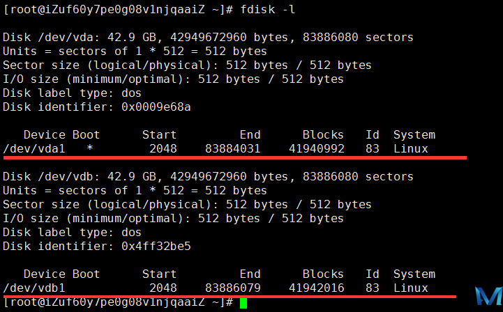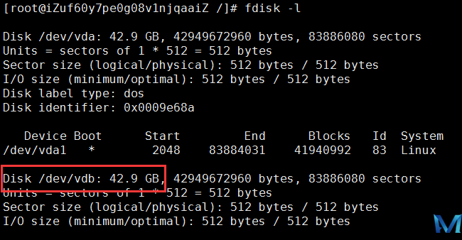 6:再次查看磁盘所有信息,就会多了一个主分区,/dev/vdb1;如下图: