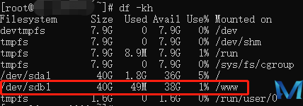 然后重新挂载到www目录中,这里我们需要先检查当前硬盘的表示名称。有的并不是/dev/sdb1。