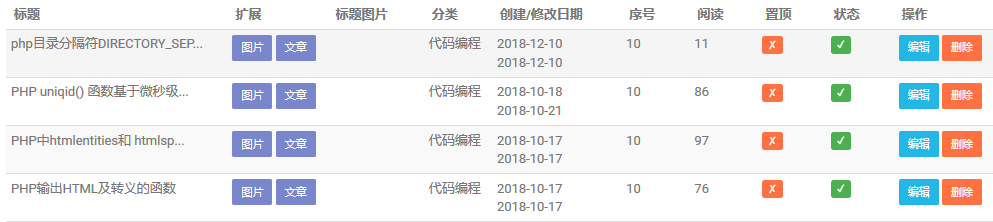 基本说明:编辑、添加、删除外,“置顶”指排序靠前,“状态”取消发布则再网站上不显示此条内容。扩展图片:增加额外关联的图片。扩展文章:增加额外关联的文章。