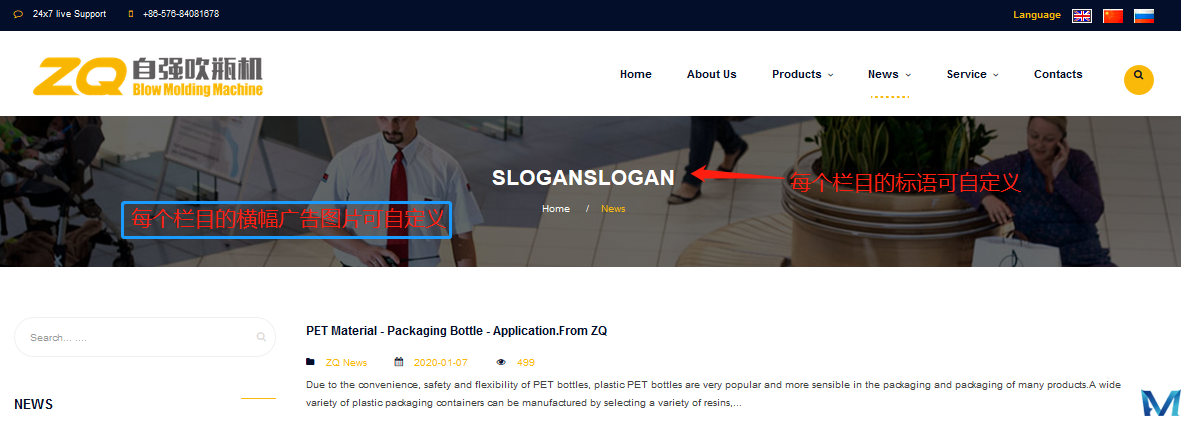 进入编辑栏目页面,修改“栏目标语”和“栏目图片”即可,留空则自动使用默认标语/图片或不显示。如果您的页面没有标语和横幅效果,请留空即可。
