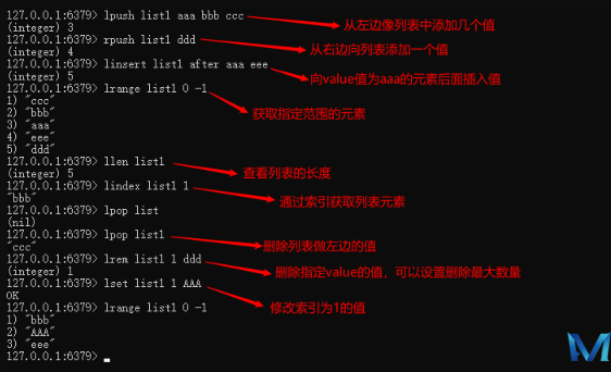 lrange key start end: 获取list 起止元素 (索引从左往右 递增)