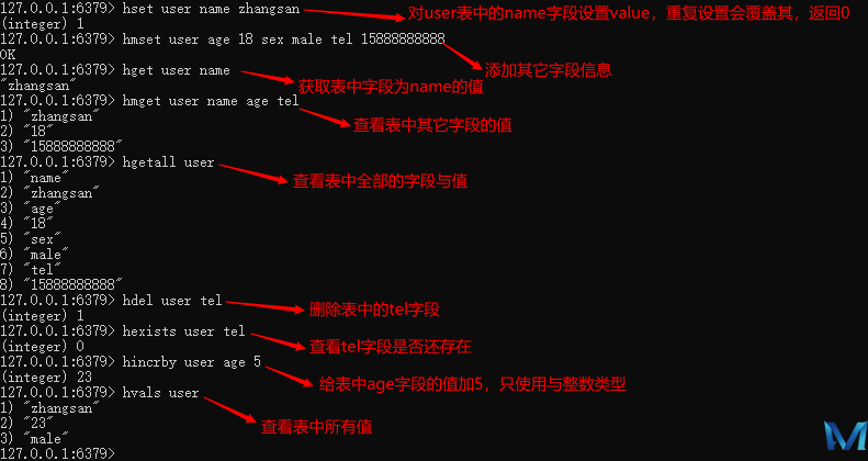 hmset key field1 value1 [field2 value2…]: 同时将多个 field-value (域-值)对设置到哈希表 key 中。
