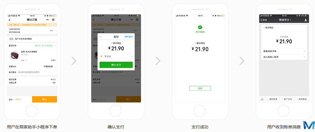微信支付支持在公众平台注册并完成微信认证的小程序接入支付功能。小程序接入支付后,可以通过小程序支付产品来完成在小程序内销售商品或内容时的收款需求。