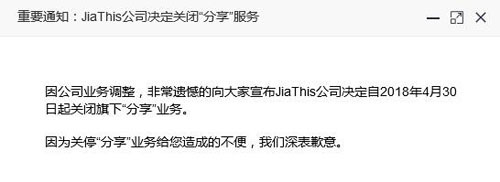 因公司业务调整,非常遗憾的向大家宣布JiaThis公司决定自2018年4月30日起关闭旗下“分享”业务。